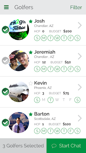 Filter golfers by handicap, budget, availability, and the app automatically displays golfers closest to your zip code within 75 miles.