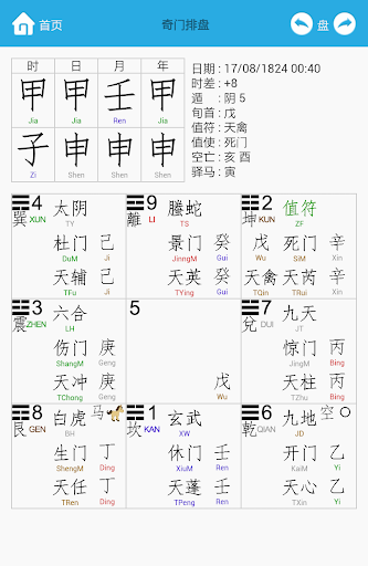 奇门遁甲排盘软件。 排盘方式运用时家奇门拆补法。
