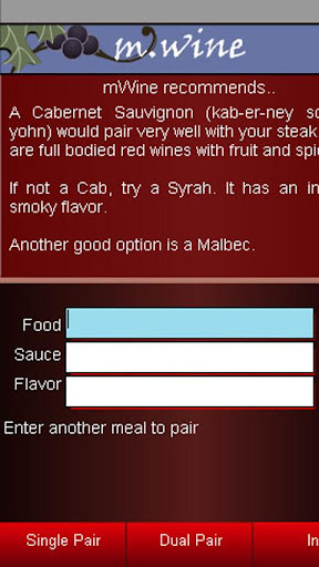 Requires Air for Android, if not present you will be prompted for automatic download. mwine is your mobile sommelier. No more wondering what wine to pick up for dinner. Enter your food with keypad or google voice, and mwine will give you THREE recommended wine types. Use dual pairing to match wine with 2 dishes.