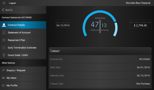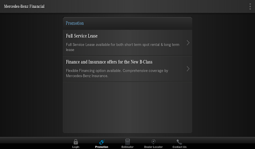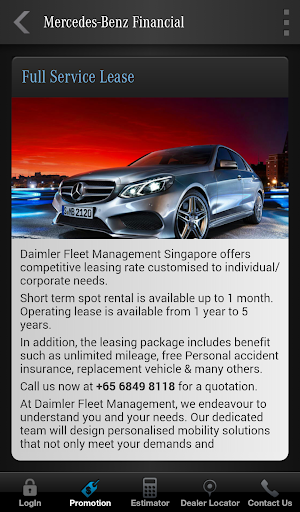 The myMBFS App allows the end user to calculate an estimated monthly instalment on the Mercedes-Benz model of their choice, request additional information and view the latest promotional offerings on Mercedes-Benz vehicles. Also included is a Dealer Locator with GPS search functionality and contact information for Mercedes-Benz Services Malaysia.