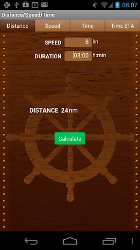 -- Distanz, Fahrt, Zeit: Berechnet 1) die zurückgelegte Distanz in sm aus der Fahrt in Knoten und der Zeitspanne in Stunden und Minuten; 2) die Fahrt in Knoten aus der zurückgelegten Distanz und der Zeitspanne in Stunden und Minuten; 3) die Zeitspanne in Stunden und Minuten aus der zurückgelegten Distanz in sm und der Fahrt in Knoten. Zudem lässt sich die voraussichtliche Ankunftszeit (ETA) ausgehend von einem Startdatum errechnen.