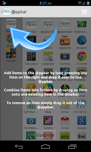 Access any of your apps from anywhere at anytime using the @ppbar. The @ppbar resides off-screen and can be accessed easily by swiping your finger in from the left or right side of your device's screen. Simple drag & drop interface makes it easy to add items to the @ppbar as well as combining items into folders.