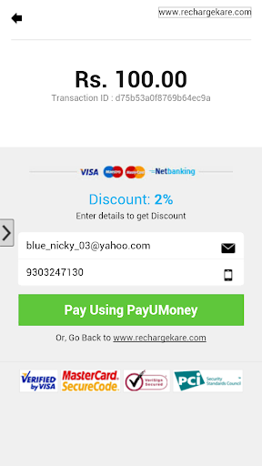 The user can view all circle wise topup & special recharge plans as he transacts and can use his credit / debit card or net banking to pay online for an instant recharge.