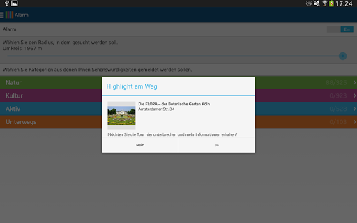 Passende Freizeitangebote findet der Nutzer über die thematische Suche oder indem er direkt die Freizeitregion vor seiner Haustüre anwählt. Neben Sehenswürdigkeiten aller Art, findet er auch Routenvorschläge zum Wandern oder Radfahren sowie Special-Angebote und Termine.
