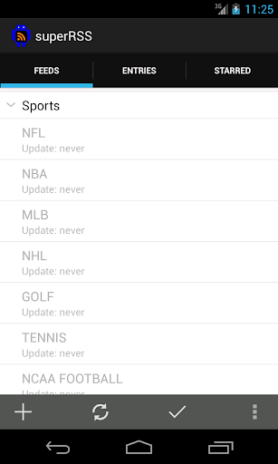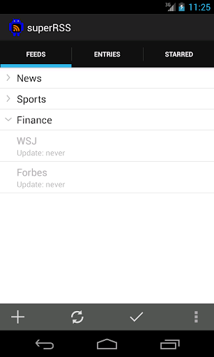 - group your feeds (comes preloaded with NEWS (3 feeds), SPORTS (10 feeds) and FINANCE (2 feeds)