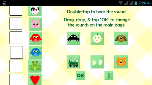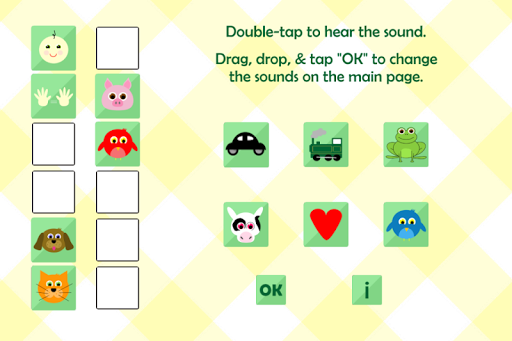 • Parents tap & hold the gear icon to set up sounds from a bank of 12 available.