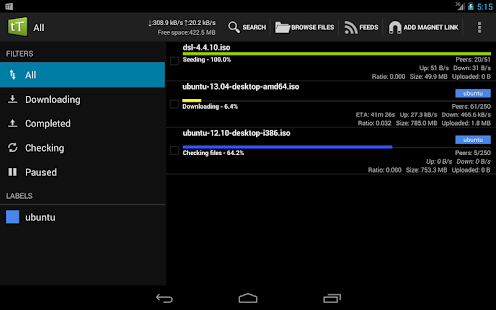 tTorrent is simply the best torrent (P2P) downloader client and tracker for Android based devices. Download large files like free movies, free music albums, free software programs, free MP3 files and other entertainment media to your phone or tablet very fast. High Speed Internet connection (Wi-Fi, 3G, 4G) necessary!