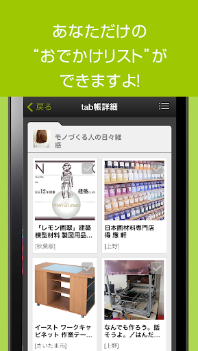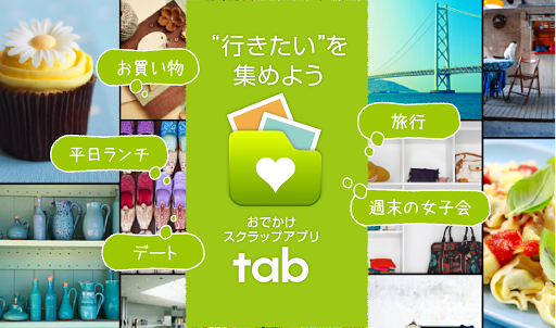 『tab』(タブ)は、テレビ、雑誌、ウェブで見つけた気になった観光、グルメ情報をカンタンに保存し、今まで行ってみたいと思っていたにも関わらず忘れていたようなところへ実際に行きたくなるアプリです。