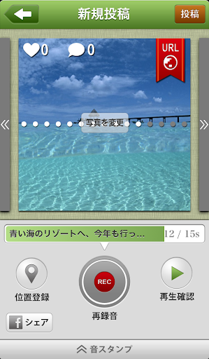 音声メッセージは、録音時に先頭から最大20文字を自動で文字変換してタイトルに登録するだけでなく、写真などの画像や位置情報、URLと一緒に投稿することができます。