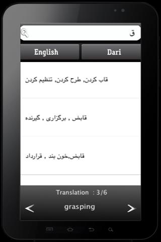 This is a comprehensive 2 way Dari English dictionary with a database of over 22000 terms. The database is contained on the user's device and no internet connection is needed to use this app.