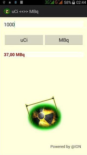 Escribe la radioactividad en MegaBequerelios en el campo de texto y pulsa uCi para convertir a microCurios.