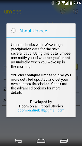 Do you ever forget to take an umbrella with you in the morning? Fix that with umbee! You'll receive a silent notification at your chosen time that indicates the precipitation chance for the morning and for the afternoon, as well as whether umbee thinks you need your umbrella that day. When you wake up in the morning and check your phone, umbee will already have figured out whether you'll need that umbrella, eliminating that "D'oh!" moment when it starts raining halfway to work.