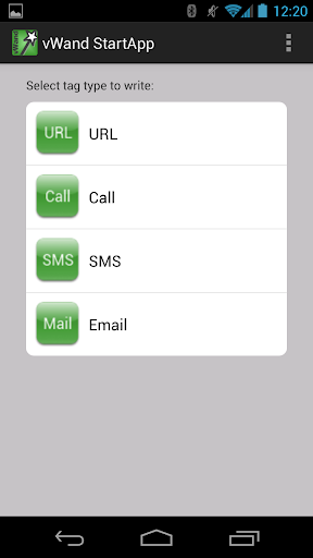 With vWand StartApp, the user can read standard NFC tags as url, mail, telephone or sms, and launch the browser, sms sender or mail client easily in user’s smartphone or tablet. User can also create new nfc tags based on these NFC Forum standards, so any NFC-enabled device can read them.