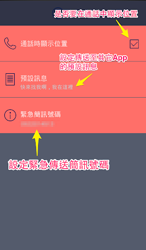 為了在危急的時候可以馬上通知親友自己目前位置,where特別設計一個【緊急分享位置功能】,可以根據您設定的緊急聯絡人電話快速發送訊息,讓親友可以快速找到您!