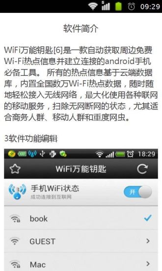 WIFI万能钥匙是一个WIFI密码分享软件, 就是比如你去一家星巴克上网, 一般上网都是有密码的, 你找服务员要到密码连上WIFI后, 你就可以把这个密码通过这个软件分享给大家, 当其他人再连接这家星巴克的WIFI时,软件就会自动使用之前别人分享的密码进行连接,不过这个软件实用性并不强,这里推荐使用WIFI伴侣,