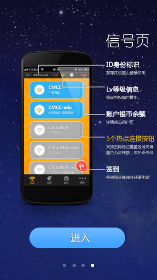 wifiin是一款帮助用户免费使用WiFi的上网工具,wifiin和移动、联通、电信三方合作,目前已支持700多万个WiFi热点,wifiin不仅帮用户承担高昂的Wlan上网费用,还便捷提供一键登录WiFi功能。