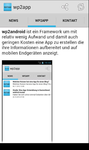wp2app ist ein Framework um mit relativ wenig Aufwand und damit auch geringen Kosten eine App zu erstellen die ihre Informationen aufbereitet und auf mobilen Endgeräten anzeigt.