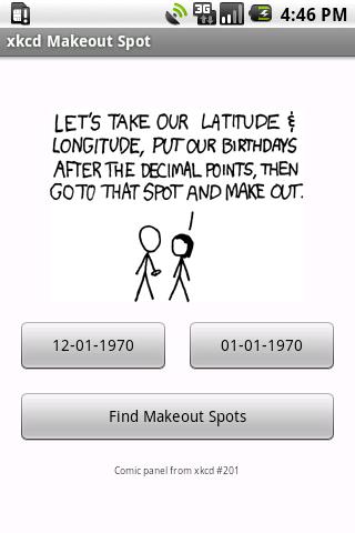 Randall Munroe's xkcd #201 suggests "Let's take our latitude & longitude, put our birthdays after the decimal points, then go to that spot and make out." Clearly, the world needs this as an Android app.