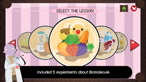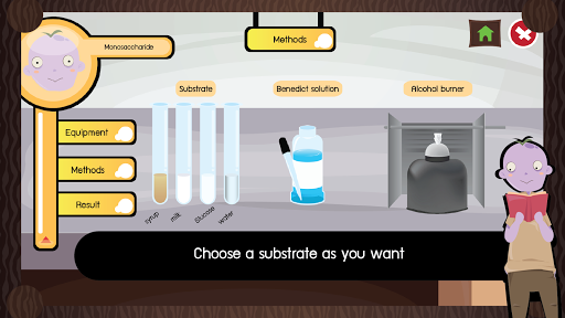 A Chemistry Learning Media. This app has 2 main parts which are how to do an experiment and laboratory. It is included 5 experiments about Biomolecule. In how to do an experiment part, this app shows tools, instructions and result in each experiments. But in laboratory part, it hasn't instructions but has various substrates in daily life.